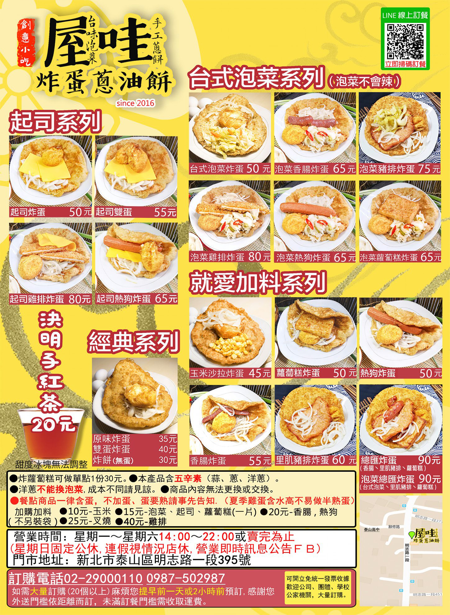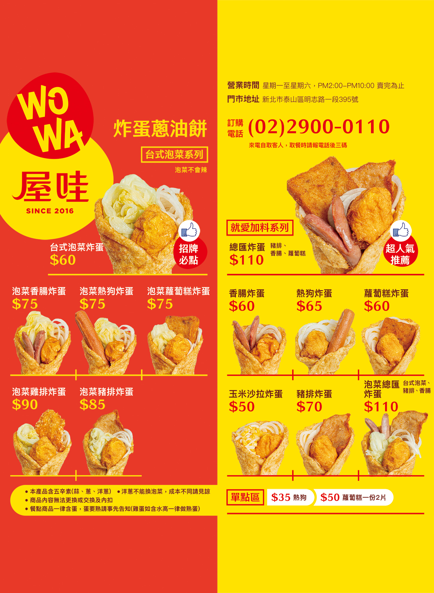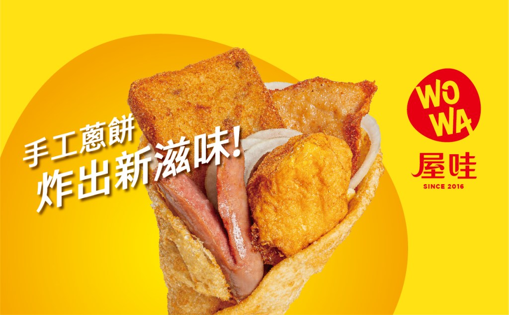 位於泰山的「WOWA 屋哇炸蛋油餅」,推出創意台味的手工蔥餅,創辦人專注於麵皮開發及特色佐搭配料,其多元的口味及選擇深受當地民眾喜愛,讓小吃的飽足感也能替代正餐!
