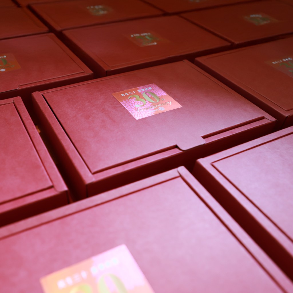 黃金年輪【紀念贈禮】,採用高光透明壓克力磚烙出年輪的意象,刻上黃金99,以四種不同的色系呈現CP/30/20/10年之社齡,每個贈禮皆由手工包裝製成,並附專屬編號之黃金購買證書。